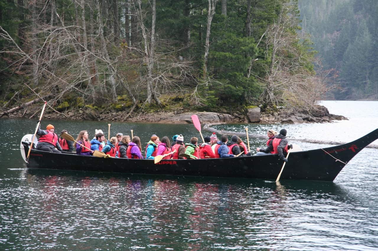 Cohort 11 paddling the Salish Dancer one last time as a whole group for the Passing of the Paddle Ceremony. (Notice the paddle in the middle of the canoe, standing upright with a red blade.) Photo by Christian Martin