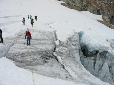 Me (in red) traversing the South Cascade Glacier for Girls On Ice 2002