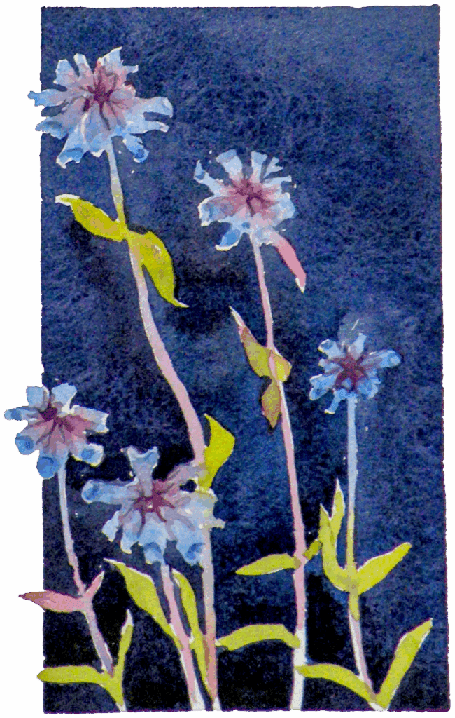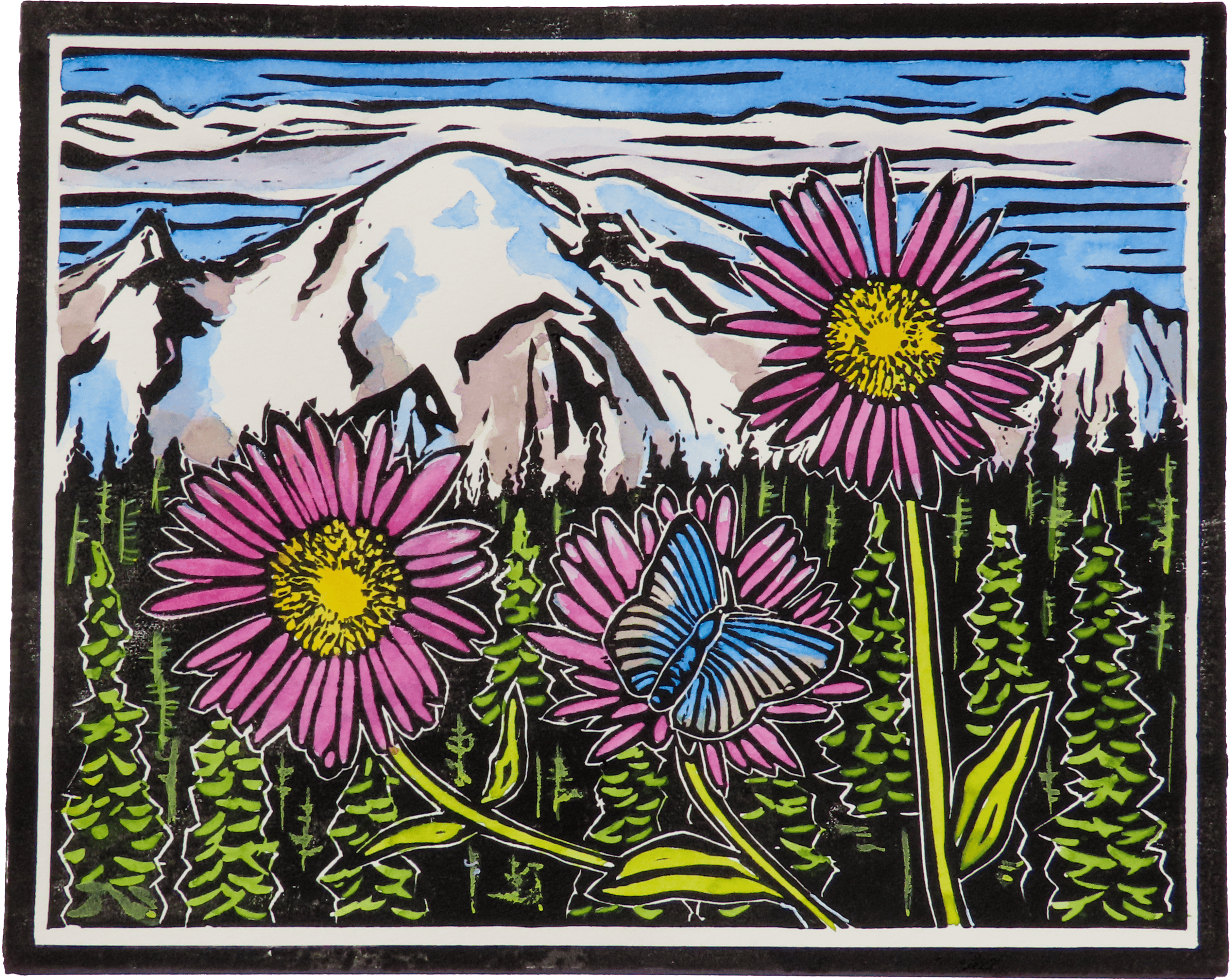 Some of the more spectacular species are glacier and avalanche lilies, blooming right beside melting snowbanks, plus Sitka valerian, paintbrush, bistort, lupines, and western pasqueflowers. Interestingly, spring comes later to the subalpine zone than the alpine zone: because the alpine zone is exposed to more wind and solar radiation, snow melts faster there than in the forested areas of the subalpine. In all the western mountain ranges at alpine elevations, the soils are very thin and rocky. Grasses and sedges grow there, but the soils are not rich, due to erosion from wind, water, and glaciation. Plants are forced to grow deep roots for nutrients and moisture and usually grow as small, cushion-like forms to protect themselves from the harsh winds; these tough survivors are often found in the lee of large rocks. On a hike from forest to subalpine to alpine, you will see marvelous adaptations of species—a lush lupine in the subalpine forest may give way to a tiny dwarf version in the harsh, tundra-like conditions of the alpine zone. Other common flowers are sedum, phlox, heather, and moss campion. I have not painted many of these because the flowers are very dainty, not well suited to block prints or watercolor.