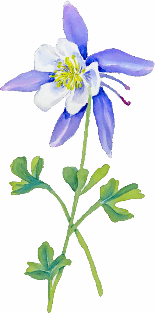 The perennial Colorado columbine deserves its designation as the state’s official flower, with spectacular blooms up to 3 inches across. The five sepals are blue to lavender, with five scoop-shaped white petals that trail blue spurs. Yellow stamens decorate the inner base of the flowers. The plant can grow up to 3 feet tall and has mostly basal leaves, bluish green underneath and with rounded lobes. This columbine is most commonly found in the moist soil of willow thickets, aspen groves, and forest openings in Idaho, Montana, New Mexico, South Dakota, Utah, and Wyoming, as well as in its namesake Colorado. Bloom time is June to August. I painted the flower without a background, allowing its stunning shape and color to speak for itself.