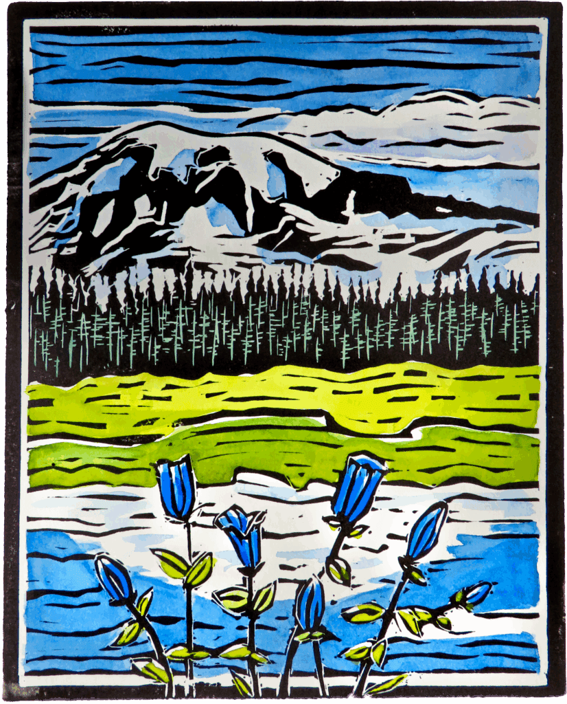 On a September day in Mount Rainier National Park, I encountered the most spectacular group of gentians I’ve ever seen, growing very close to the lower Sluiskin Falls of the Paradise River. The gentians were thriving in that moist location, creating a luxurious splash of blue-violet, a color like the zenith of Rainier’s sky. I created both a block print and a pen and watercolor sketch of the gentians. For the block print, I decided to position the flowers on the edge of one of the Reflection Lakes, a few miles southeast of Paradise (see the “Mount Rainier National Park” sidebar, page 128). I so identify the flowers with Rainier that I wanted to show them in this much-photographed location, where the mountain is mirrored in the lake, surrounded by moist subalpine meadows. In the sketch, my goal was simply to reproduce the profusion of flowers.
