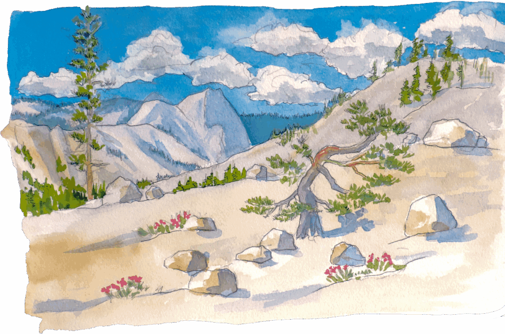 A trip up the Tioga Road with my students from Yosemite Conservancy was a highlight of the class I taught there one June. We walked a short distance up the granite slabs from Olmsted Point and were astonished at the variety of flowers blooming. It was not only the marvelous views but also the plant life growing right out of the cracks in the rocks that made this one of the most precious adventures I’ve ever had. I made a watercolor sketch on-site, and later, back in the studio, I felt that it needed more definition, so I added some pen lines.