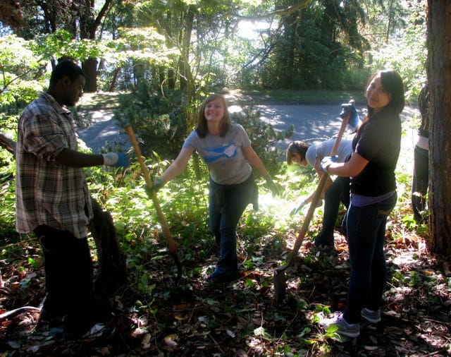 After a game of re-introductions, NC Wild joined forces with staff from Seward Park & Recreation and students from the local Student Conservation Association to give back to the park by removing invasive Himalayan blackberry and English ivy. With that many hands to work, the area was cleared in no time, and a celebration ensued. Students from both groups were able to share with each other their outdoor experiences as a means to encourage youth leadership and stewardship in the future.