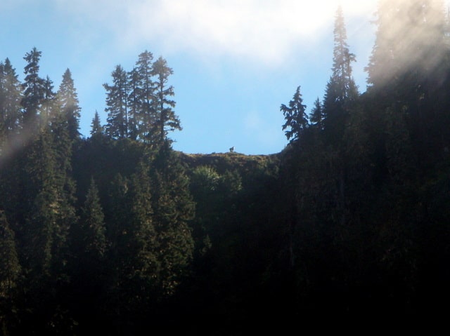There, perched atop the cliffs above the lake, stood a single mountain goat. Its white coat shone brightly in the sun rays peeking out through the dissipating afternoon clouds, reflecting the dew from morning. It stood still, silent, looking down upon us as we grabbed for binoculars and gasped again and again with glee. For ten minutes it remained in view, and then slowly sauntered off behind the trees.